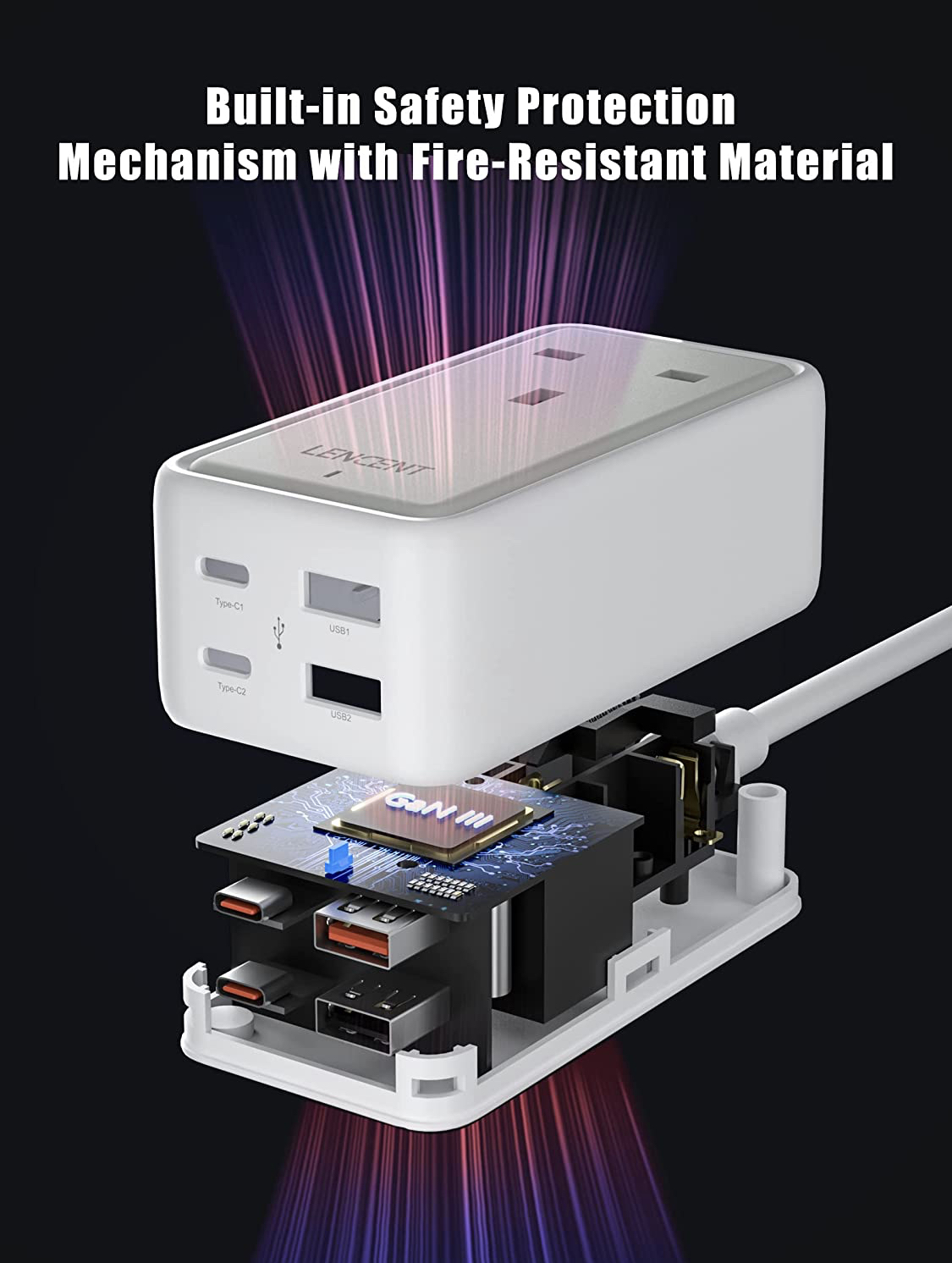 【5 IN 1 USB Charging Station】LENCENT 65W charger enables to power 5 devices at the same time via 1 AC outlet(2500W Max), 2 PD USB-C ports(65W Total) and 2 USB-A ports(65W Total). It will satisfy all your charging needs at home and the office.